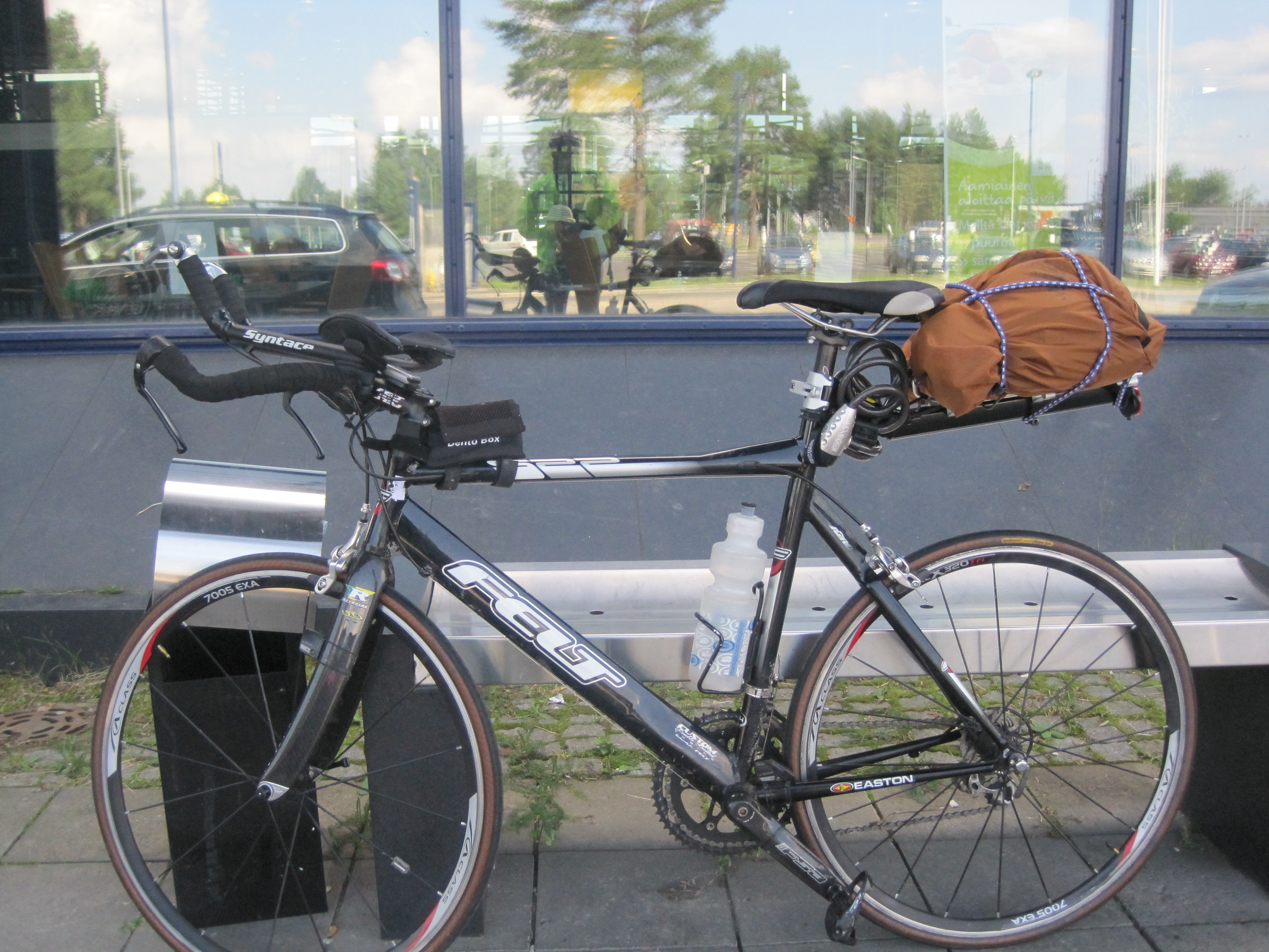 Landed in Oulu Airport late afternoon, only to then suffer the indignity of my trusty bike being dumped onto, and carried around  floundering on, the baggage conveyor belt.  No lasting harm done. Put bike together outside Arrivals (see pic).  Bit of a ‘Bucks Fizz’ moment, much to the delight of the onlooking taxi drivers, as I whipped off my strides to reveal by cycling shorts beneath.  One of them fainted. Probably.